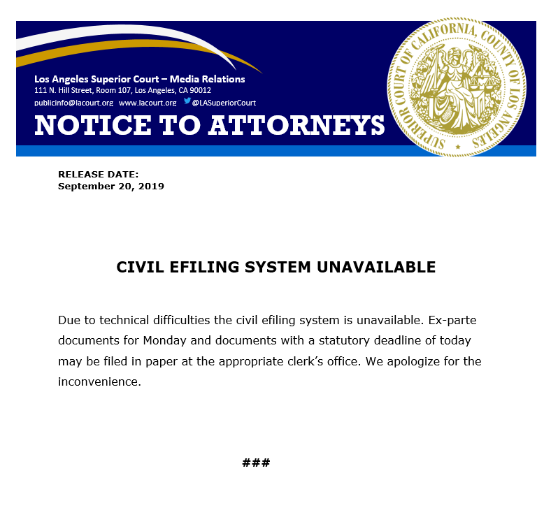 Due to technical difficulties the court’s civil eFiling system is unavailable. Ex-Parte documents for Monday and documents with a statutory deadline of today, Friday, September 20th, may be filed in paper at the appropriate clerk’s office. CLICK HERE to View the Court’s Notice